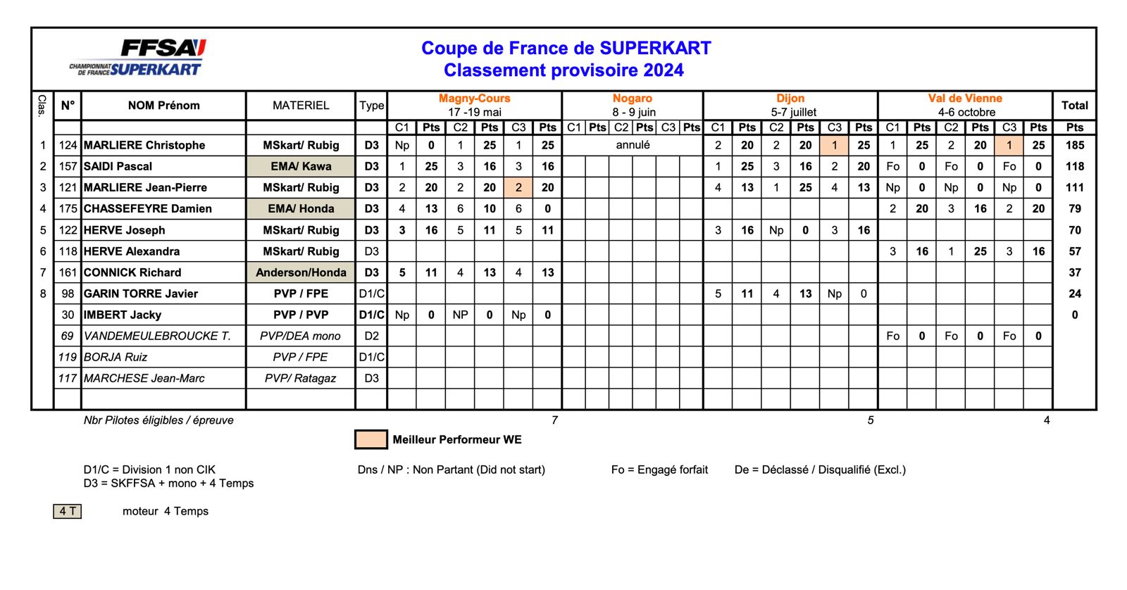 | 2024 | Superkart | Coupe de France FFSA | Classement Championnat | P5/9 Résultats Détaillés |